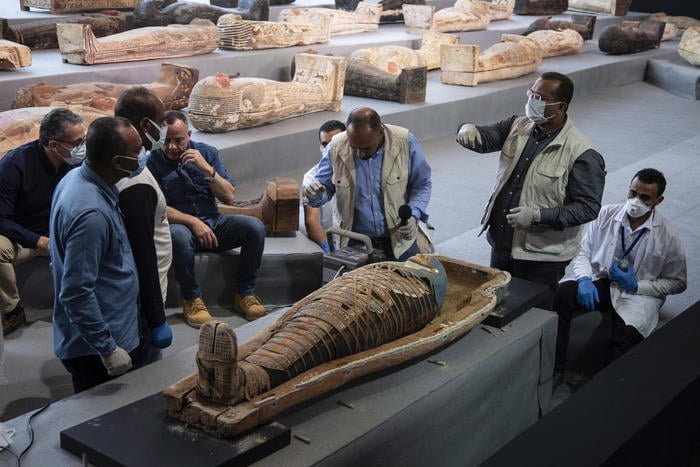 Il ministro egiziano del Turismo e delle Antichità Khaled el-Enani lo ha definito “un tesoro”. I sarcofagi appena svelati, assieme a una quarantina di statue di antiche divinità e a diverse maschere funerarie, sono stati trovati in pozzi funerari profondi 12 metri. Gli archeologi hanno aperto una delle bare, trovando una mummia avvolta in un sudario ornato con geroglifici colorati. Inoltre, due statue di legno sono state trovate nella tomba di un giudice della sesta dinastia, antica di oltre 4 millenni.