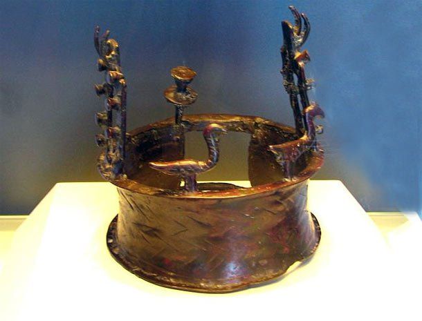 La New York University ha scritto: “Un oggetto di enorme potere e prestigio, la corona di rame annerita e frastagliata, le enigmatiche protuberanze lungo il suo bordo di avvoltoi e la costruzione di facciate con aperture quadrate e la sua forma cilindrica, suggeriscono legami con le pratiche di sepoltura del tempo. ”