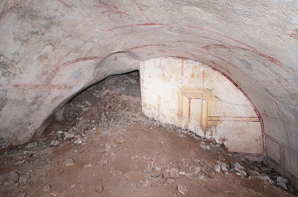 La camera, soprannominata la Sala della Sfinge, è riccamente decorata con murales di creature reali e mitiche tra cui una sfinge. Dipinta con ricchi pigmenti rossi, verdi e gialli che sono sopravvissuti incredibilmente bene negli ultimi due millenni, la stanza a volta è anche decorata con immagini di un centauro, il dio Pan, una miriade di piante e ornamenti d’acqua e la raffigurazione di un uomo che estrae la spada mentre viene attaccato da una pantera.